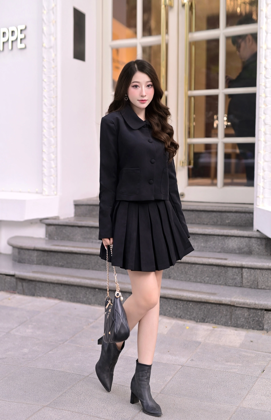 Set áo khoác dáng ngắn phối phân váy xếp ly basic