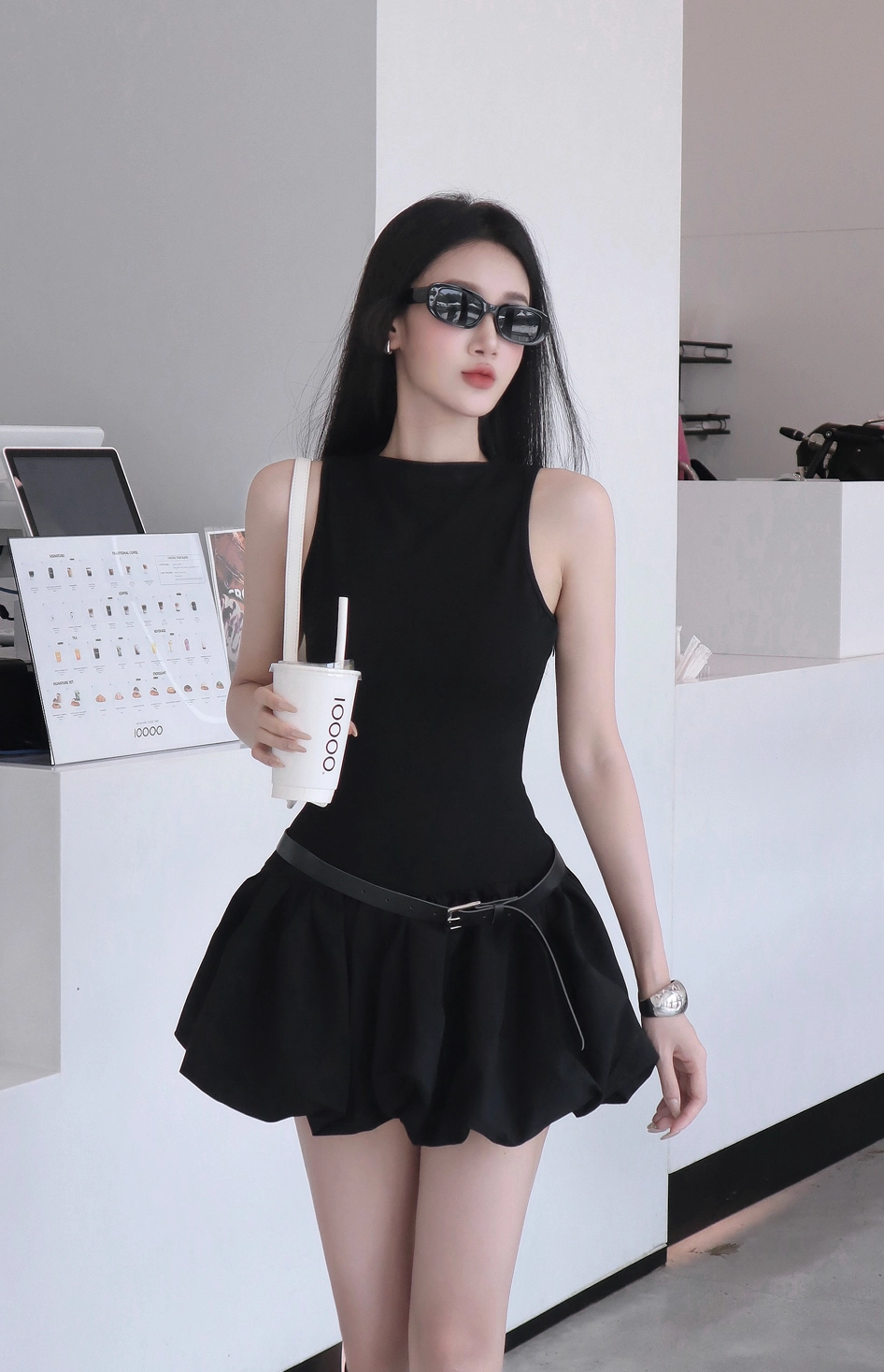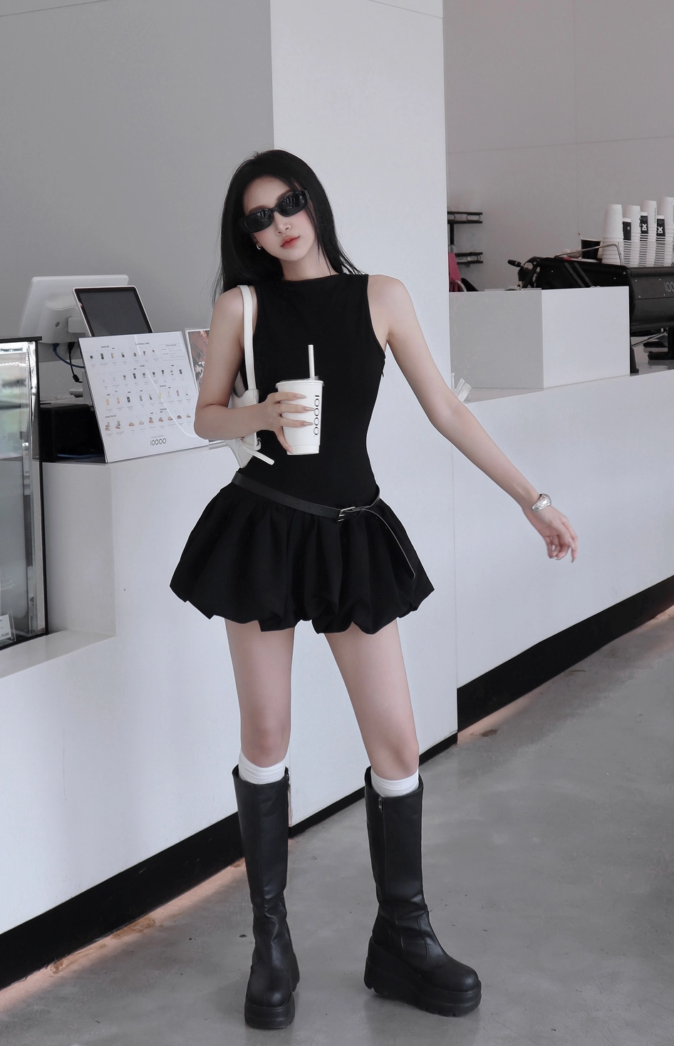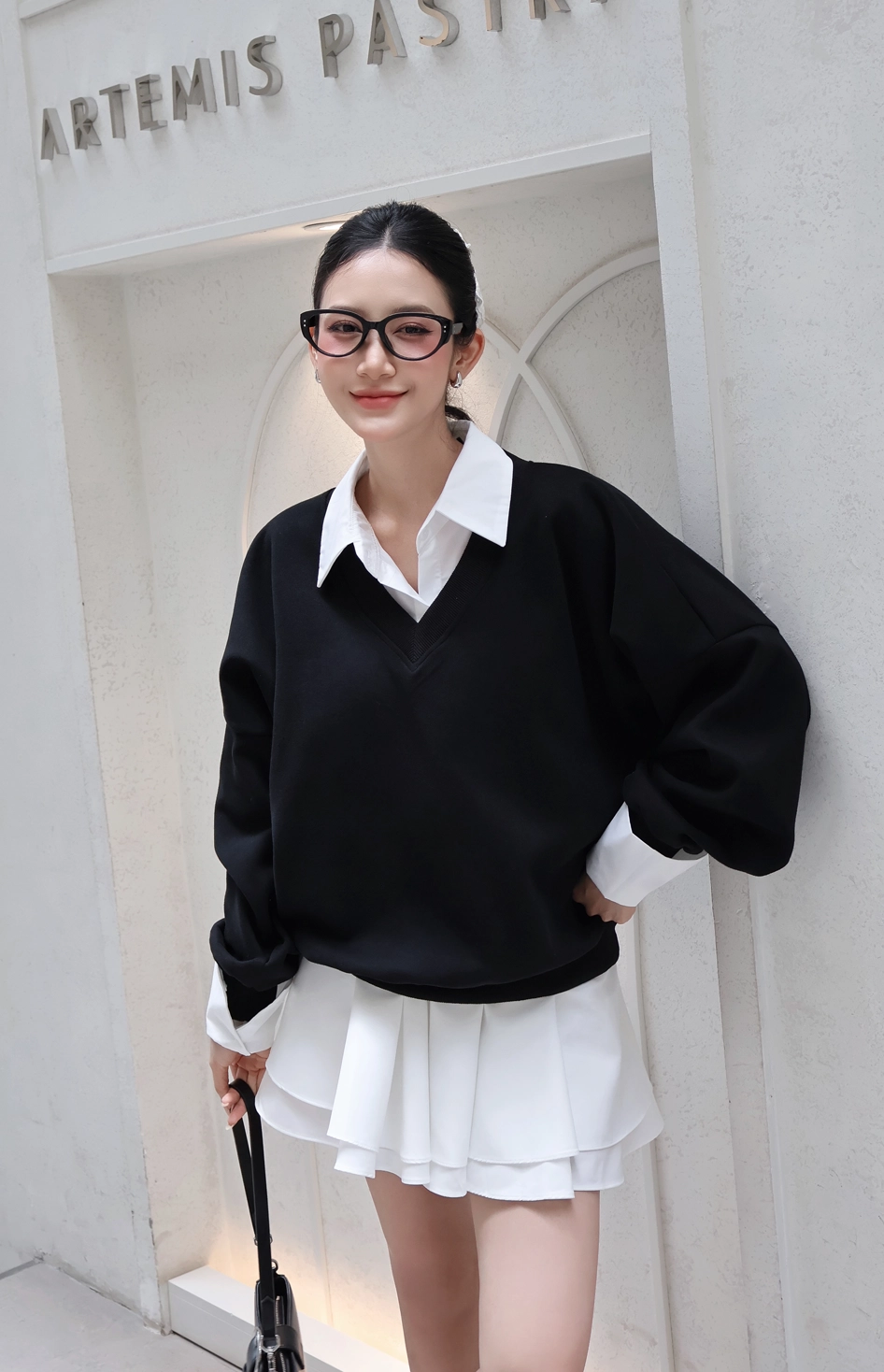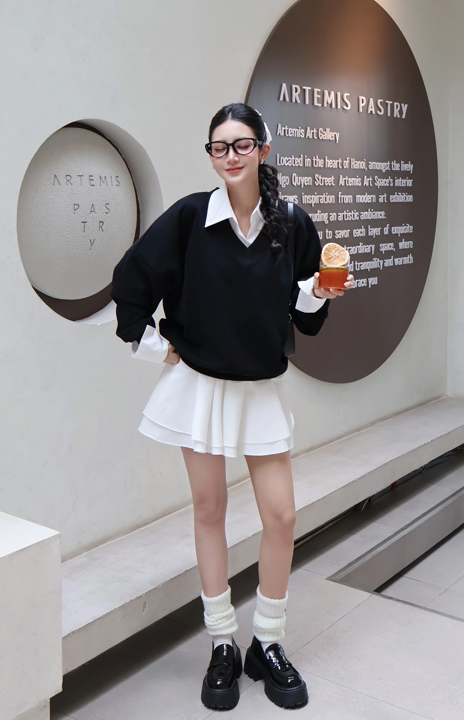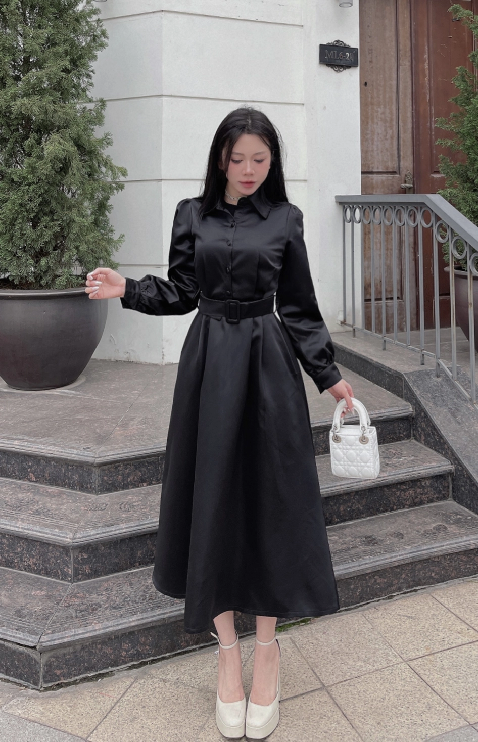 Set váy sơ mi kèm đai phối áo khoác croptop tay bồng