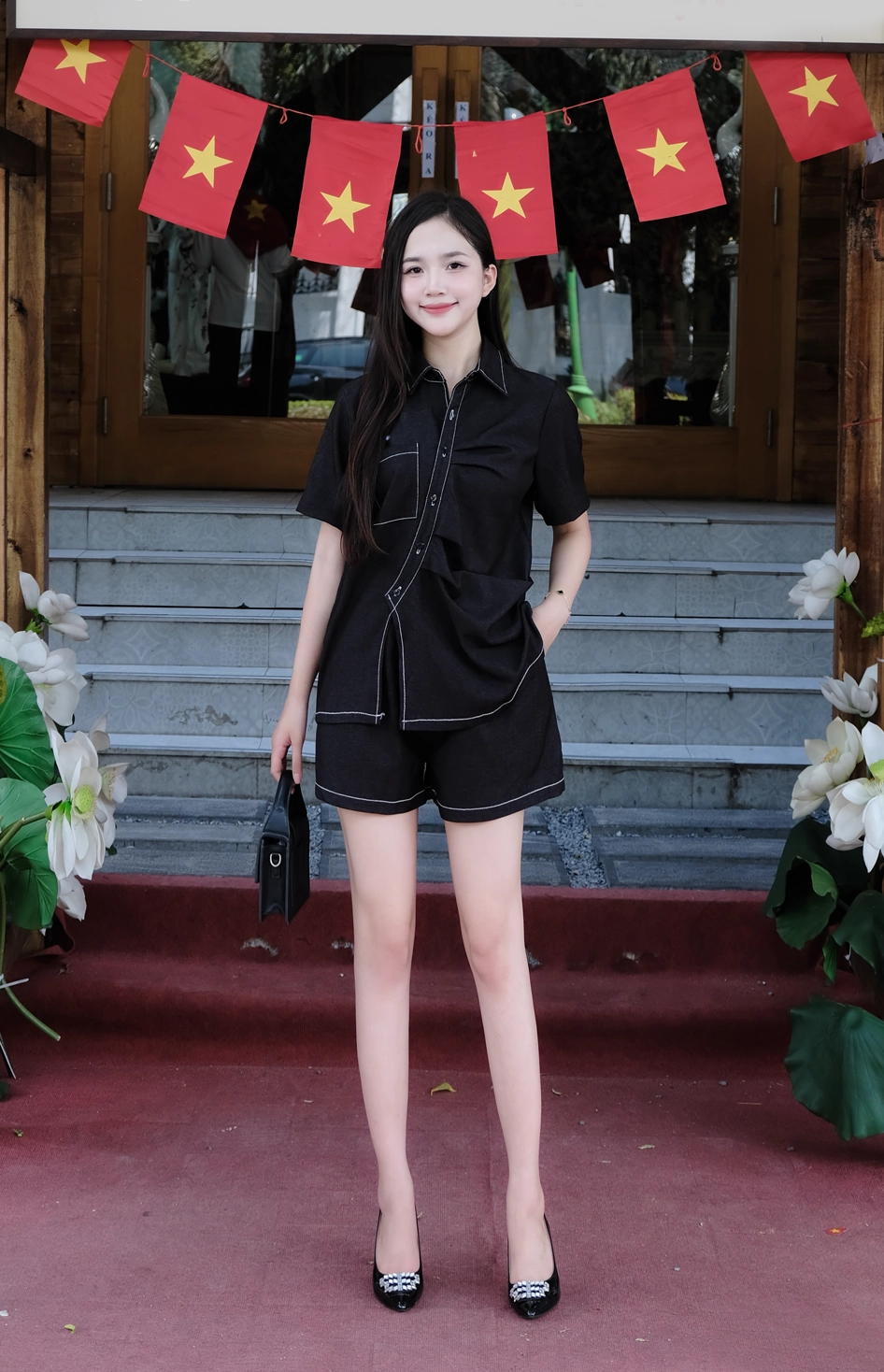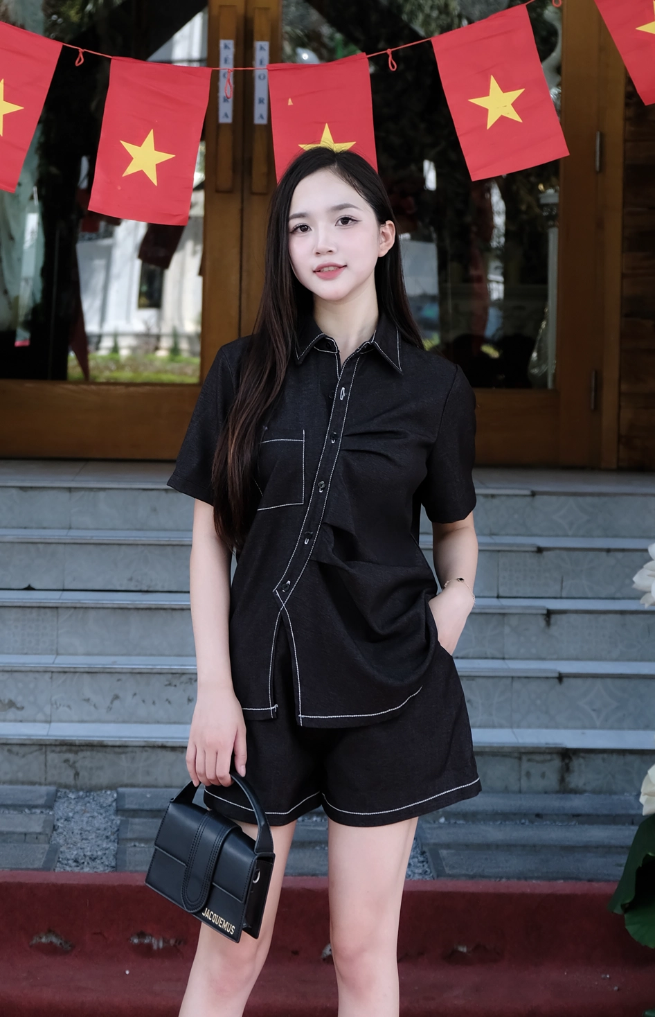 Set áo sơ mi jean lụa dáng dài phối nút chéo
