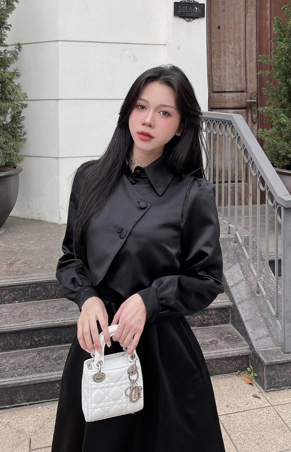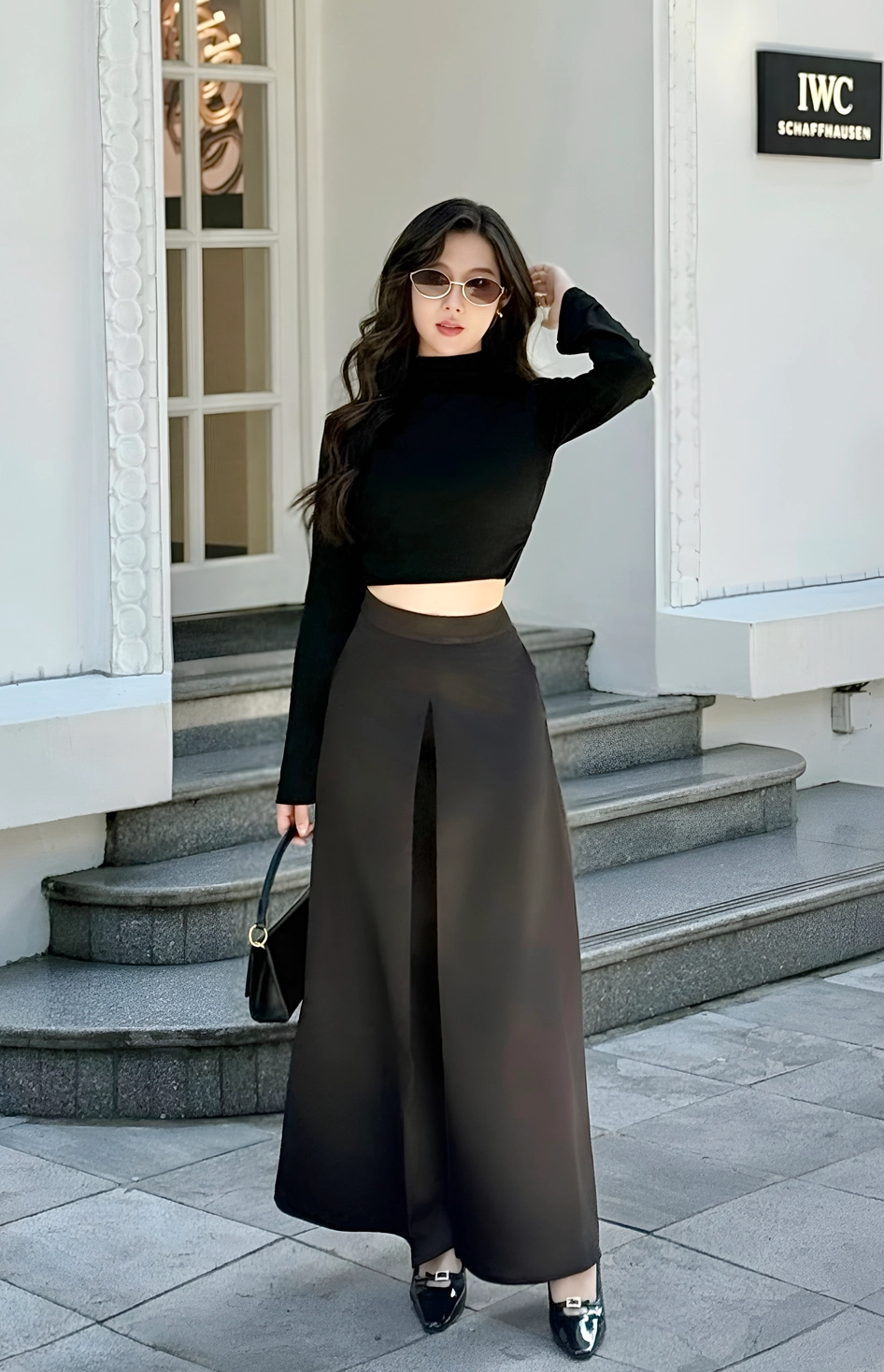 Set áo croptop cổ cao dài tay phối chân váy Tafta