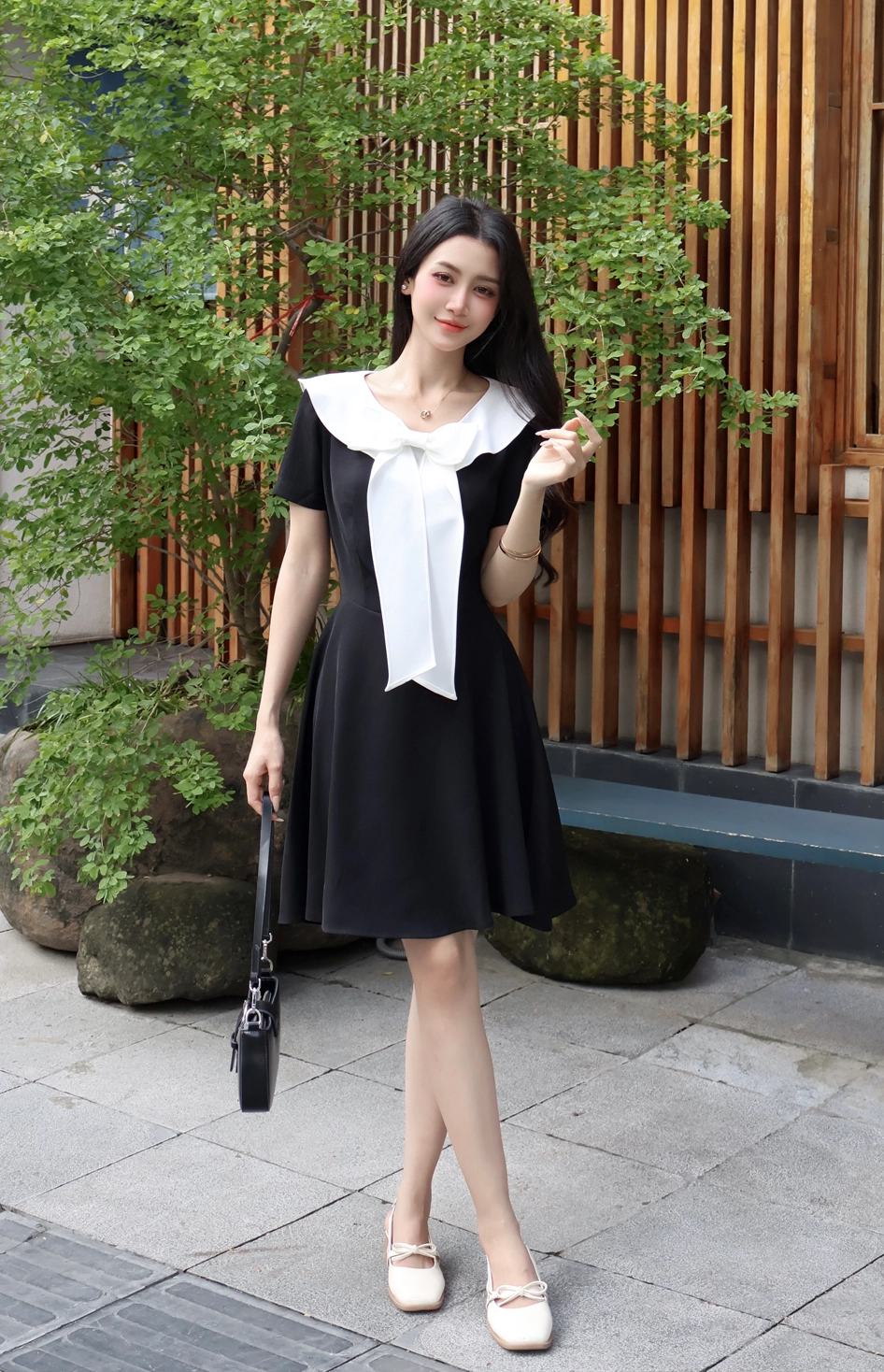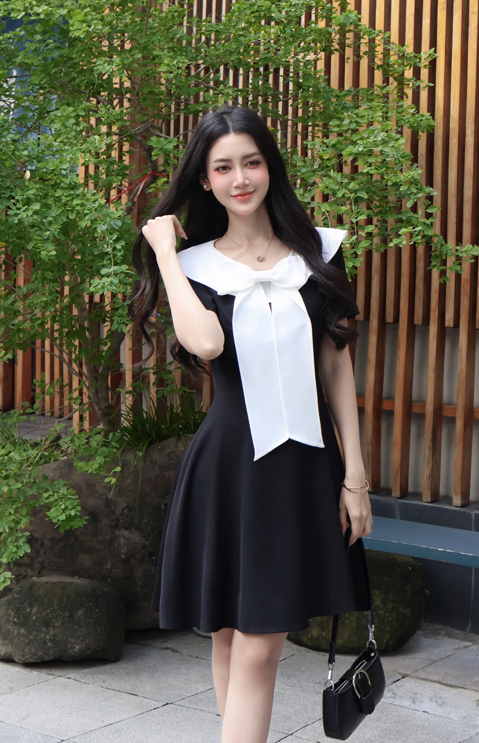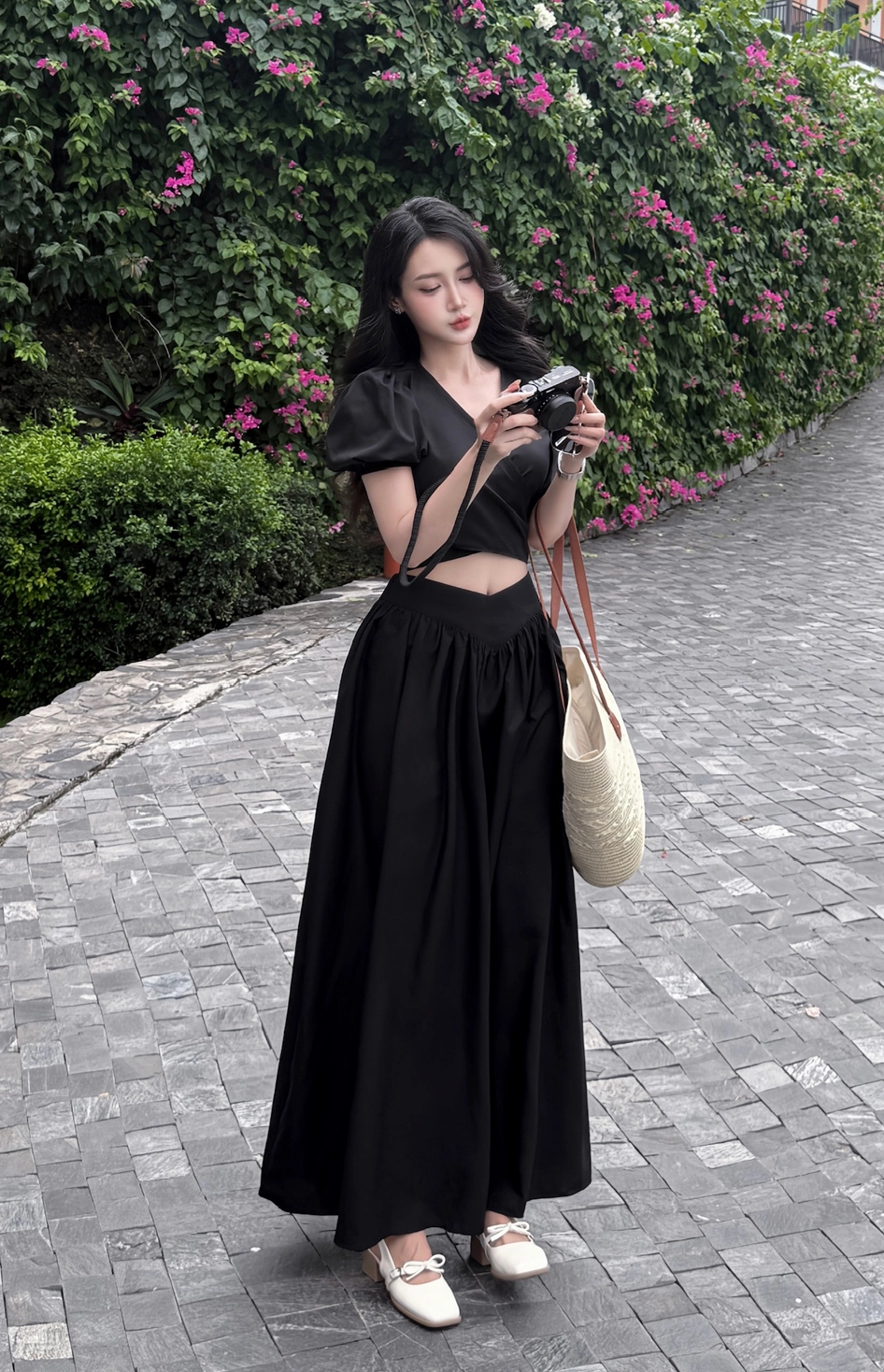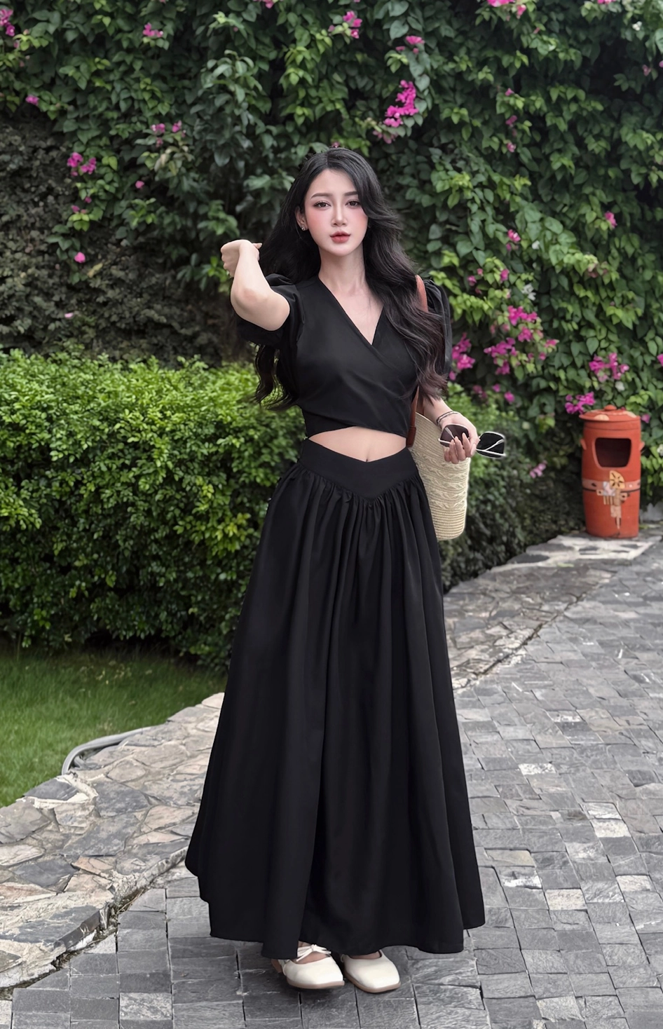 Set áo croptop nơ sau & chân váy dài dáng xòe