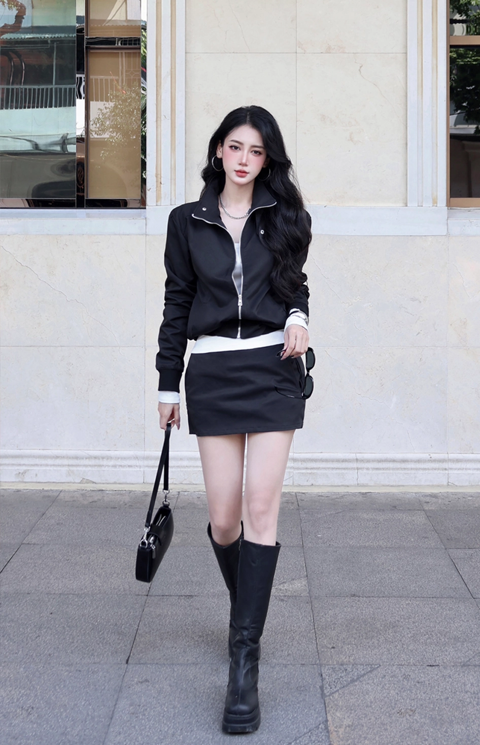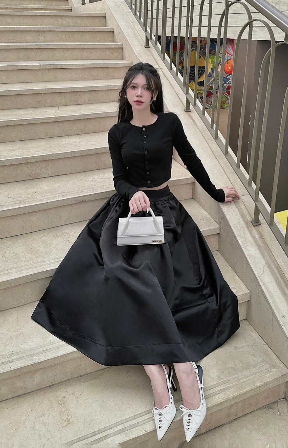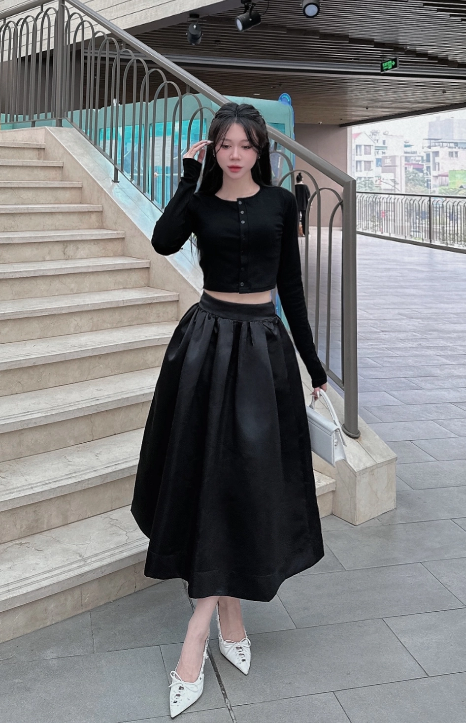 Set áo croptop cúc ngực + chân váy xòe bồng