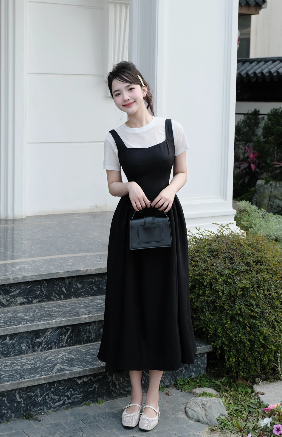 Set váy yếm dáng dài mix áo phông ngắn tay