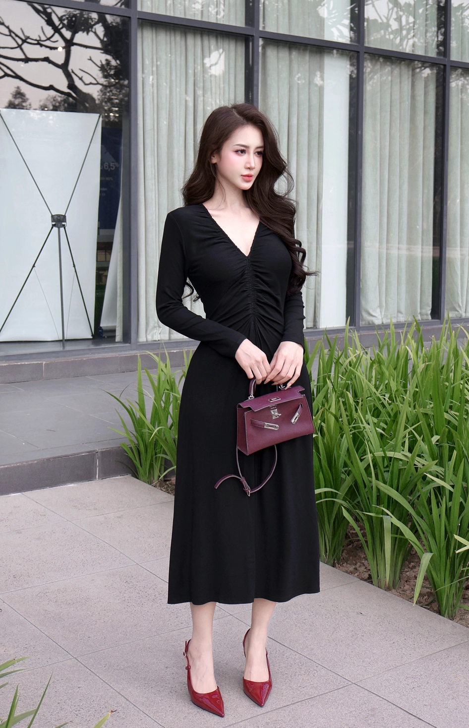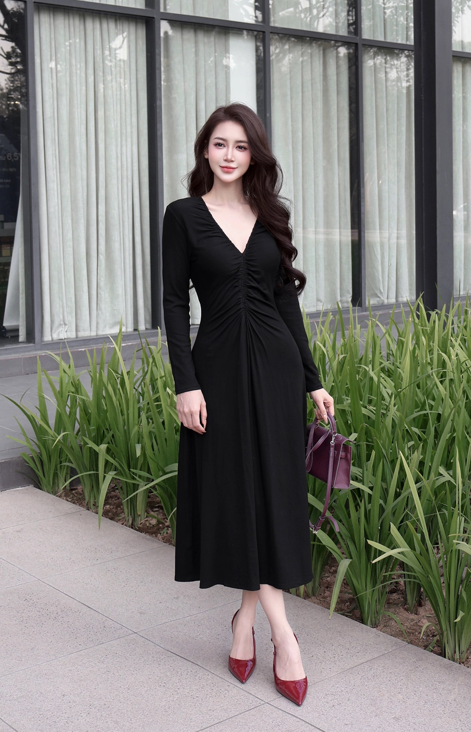 Đầm body dáng dài cổ V nhún ngực