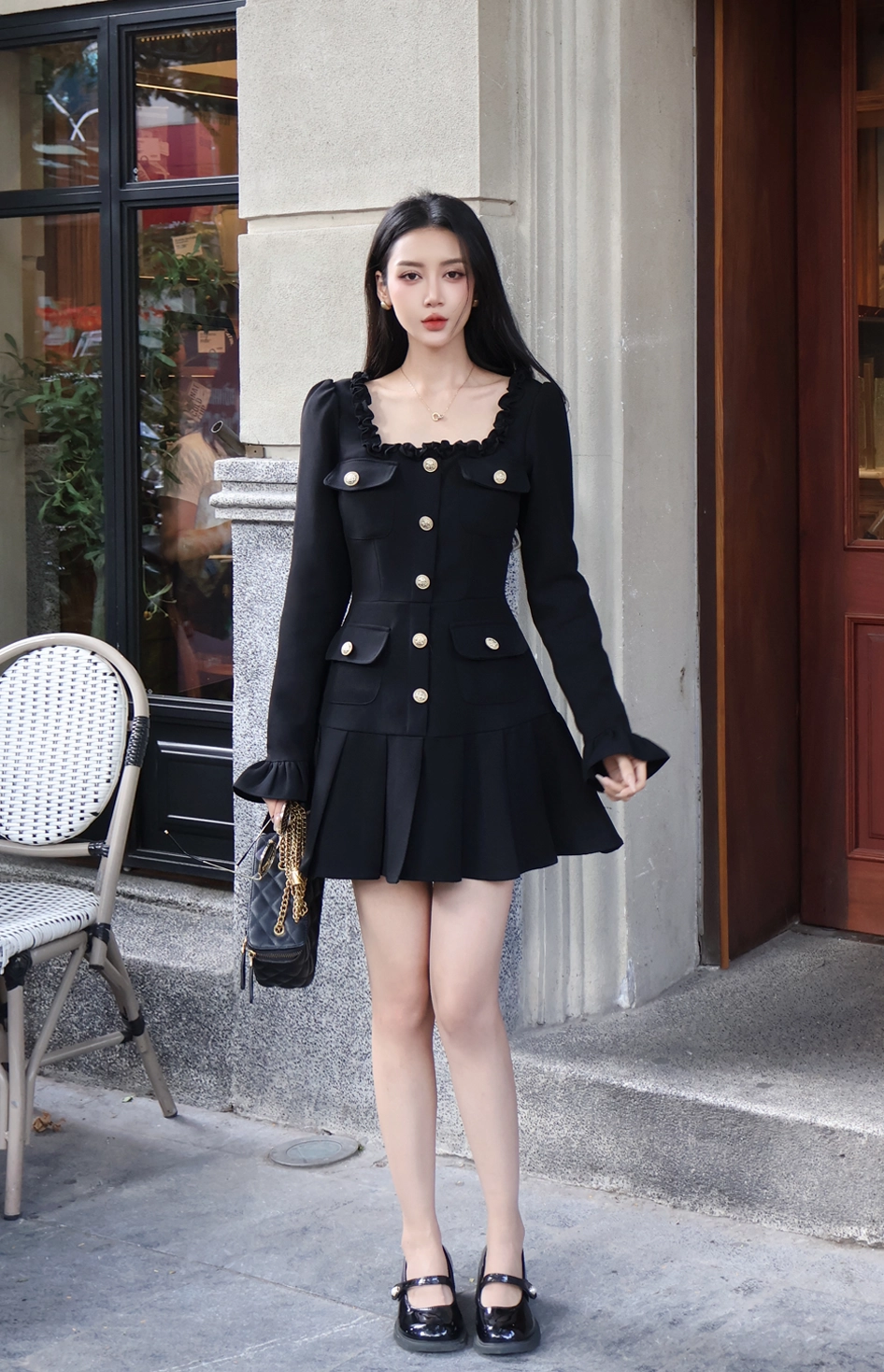 Váy thiết kế cổ vuông bèo phối cúc dáng ngắn